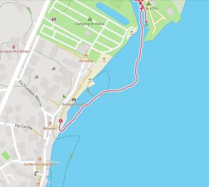 Anlegestelle: unter einer kleinen Brücke direkt am Restaurant/Café/Eiscafé Mirafori (eine Möglichkeit unsere Boards dort mit unseren verschließbaren Stahlseilen zu sichern – ohne dass man die Plätze für die Boote behindert – war gegeben).